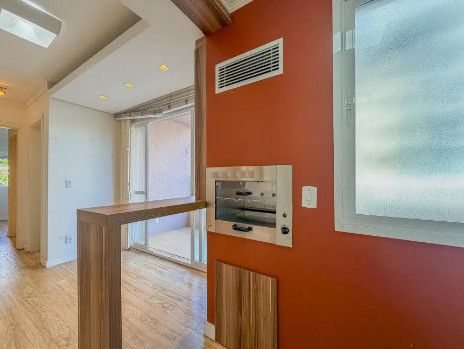 O imóvel possui uma planta inteligente e funcional, composta por dois dormitórios, sendo uma suíte, garantindo privacidade e conforto. O diferencial técnico da unidade inclui a presença de um lavabo, além do banheiro social, otimizando a área social para recepção de visitas. A sala de estar integra-se perfeitamente à sacada equipada com churrasqueira, um atributo altamente valorizado no mercado gaúcho que amplia as possibilidades de convívio.